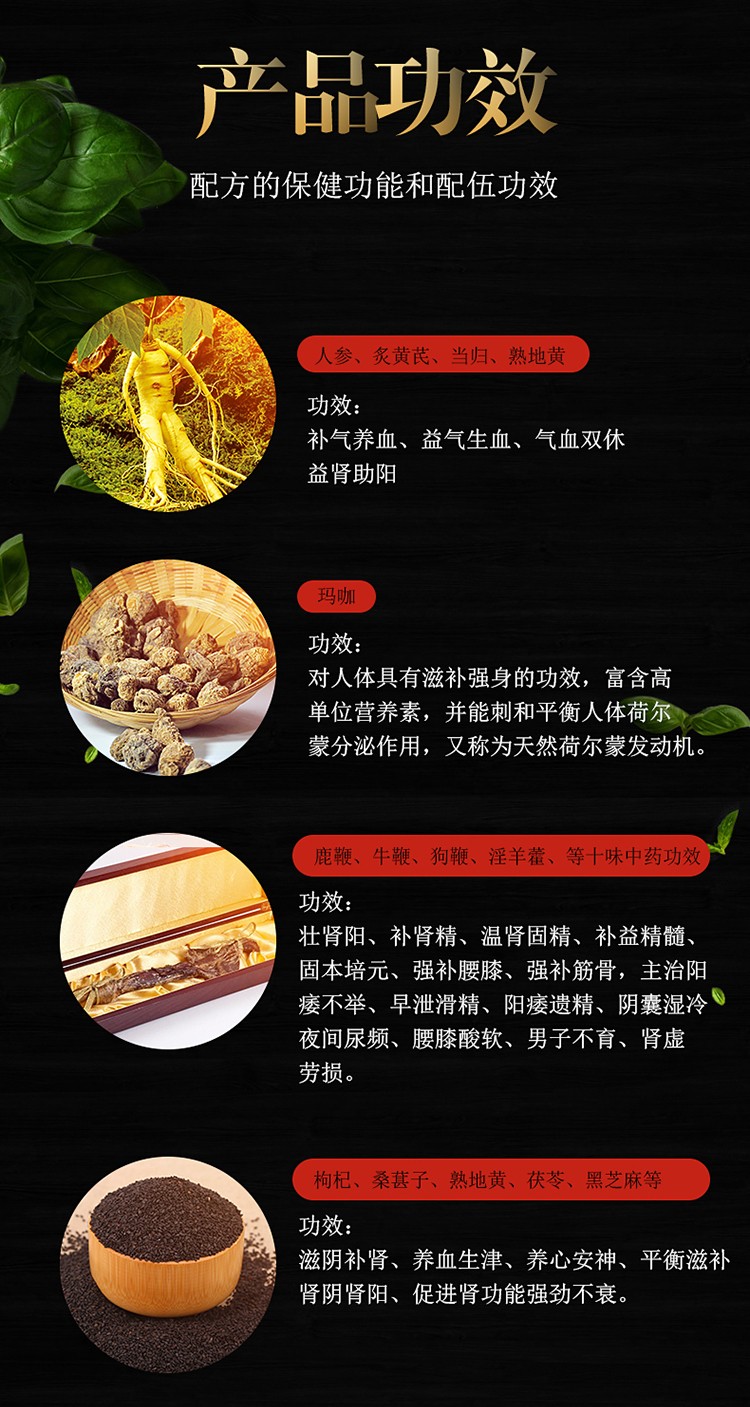 水、蜂蜜、玛卡粉、人参(人工种植)、鹿鞭、狗鞭、牡蛎、牛鞭、黑豆、桑葚、肉桂、枸杞子、茯苓、覆盆子、黑芝麻、大枣、食品添加剂:山梨酸钾。 本品每100ml含玛卡粉5g、人参(人工种植)3g